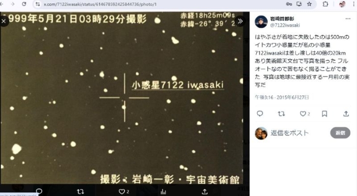 岩崎賀都彰IAU(国際天文学連合)の承認で 1989年3月12日 小惑星7122iwasaki を与えられた。