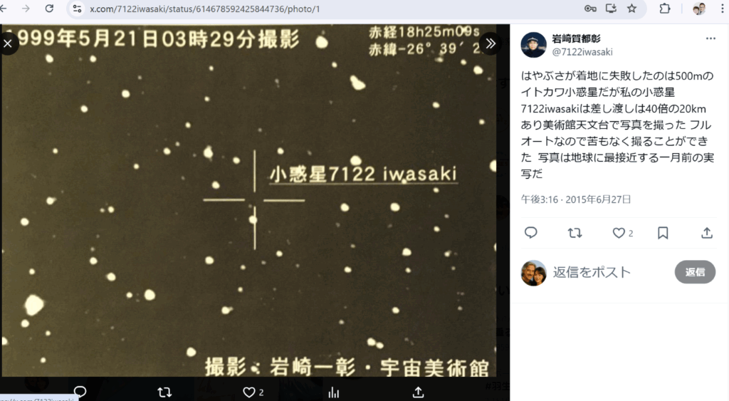 はやぶさが着地に失敗したのは500mのイトカワ小惑星だが私の小惑星7122iwasakiは差し渡しは40倍20kmあり美術館天文台で写真を撮ったフルオートなので苦もなく撮ることができた 写真は地球に最接近する一月前の実写だ