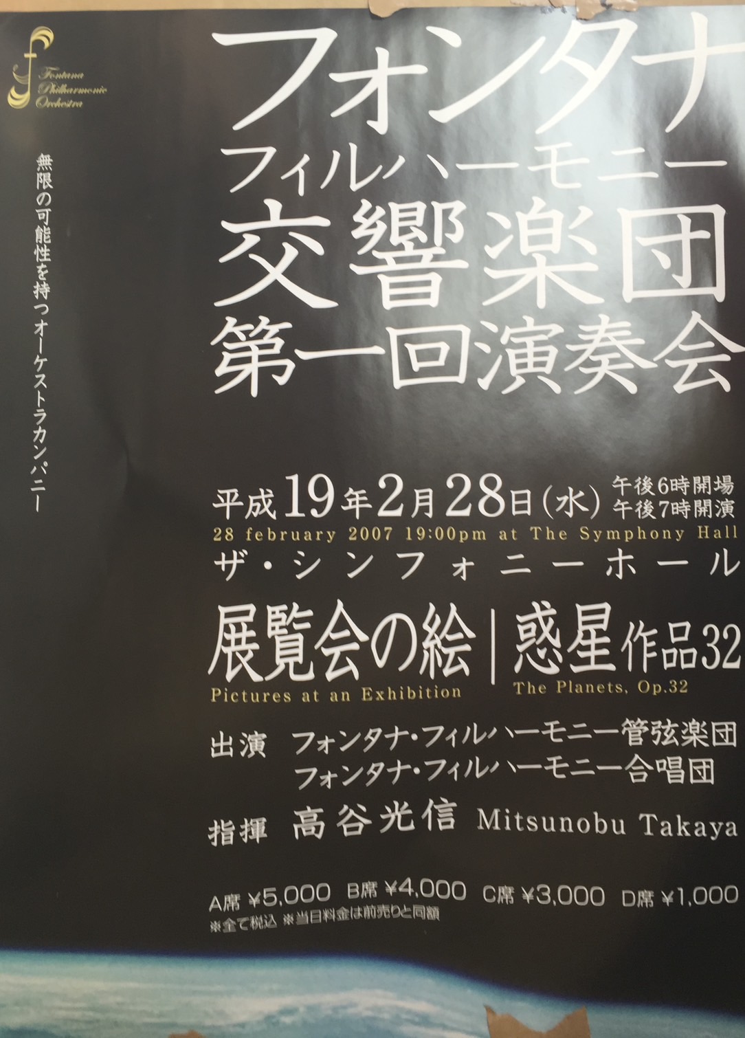 2007年2月28日 フォンタナ・フィルハーモニー交響楽団 第一回演奏会(於、大阪シンフォニーホール)プログラム「展覧会の絵」「惑星」各メディア・新聞に取り上げられる。当日チケット窓口で「1万円の偽札」が見つかり、開演が16分遅れた。