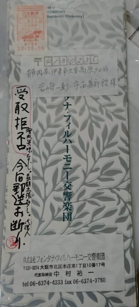 • フォンタナ・フィルハーモニー創設直後 大阪・東京でのお披露目公演/第1回公演に招待するも、受取拒否され招待状には受け取り拒否通知が父の文字ではない張り紙付きで未開封で返送される。