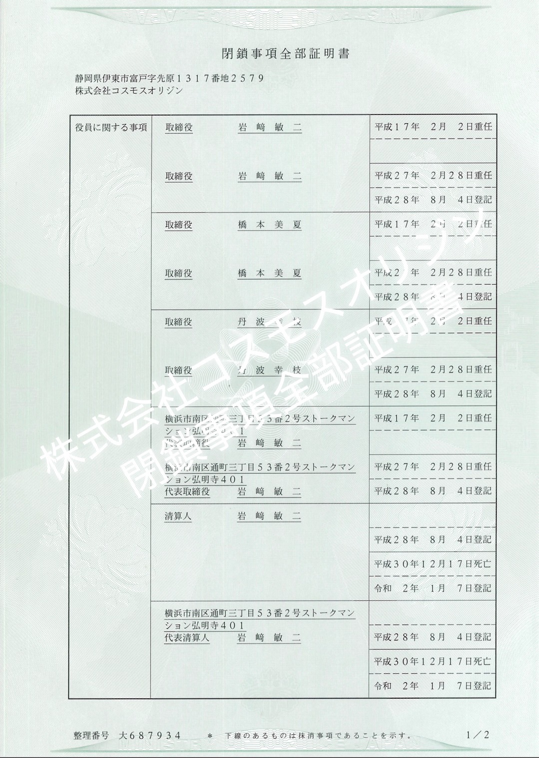 • 清算人は2005年取締役就任の異母妹と、2007年取締役就任の「丹波幸枝」