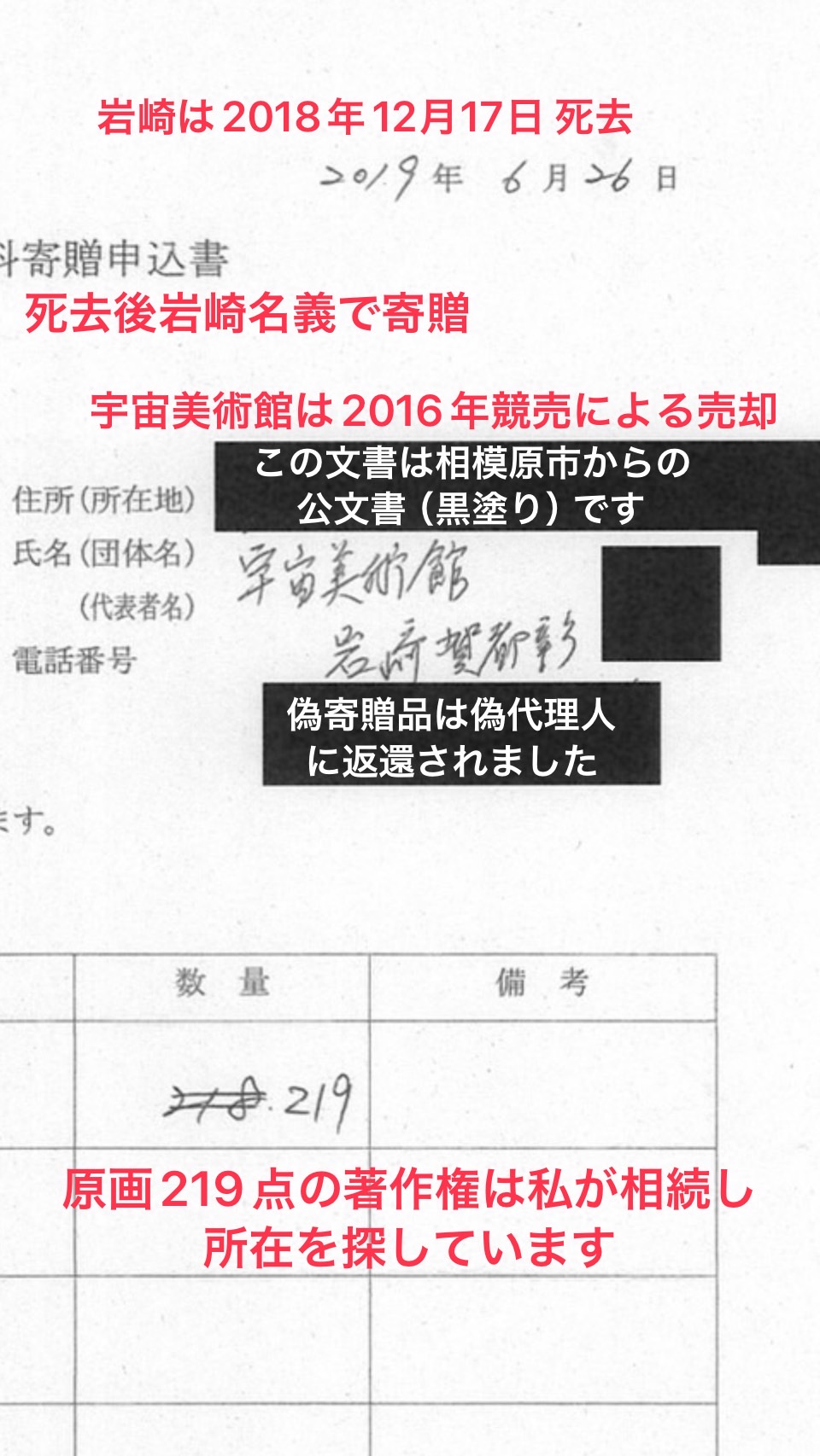 寄贈申込書受理(団体名:宇宙美術館、所有者:岩﨑賀都彰)