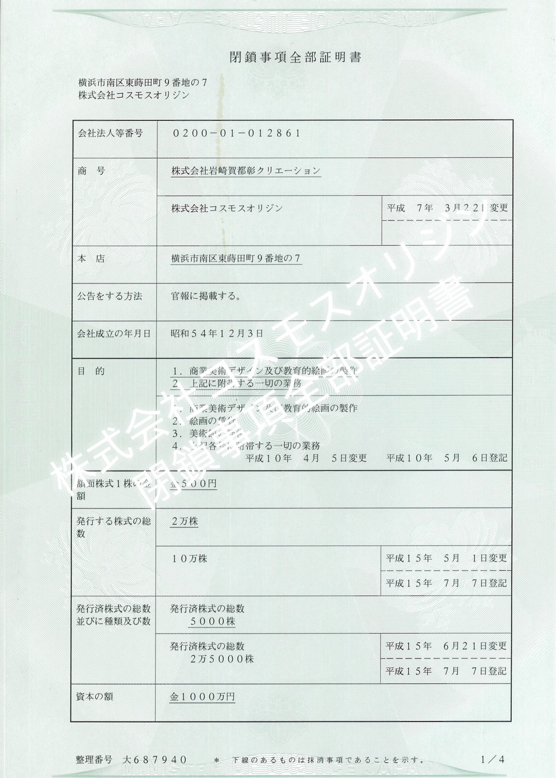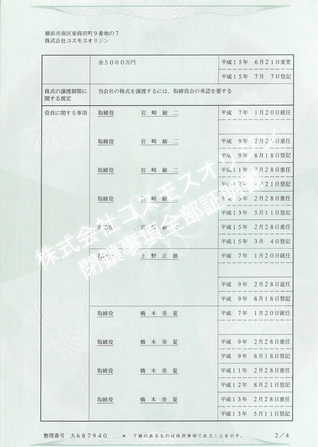 2003年 7月 7日 (株)コスモスオリジン 増資により 資本金5000万円